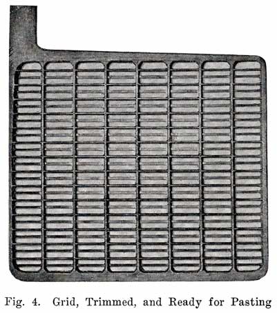 Trimming the Grids. When the castings have cooled, they are removed from the moulds and passed to a press or trimming machine which trims off the casting gate and the rough edges. The grids are given a rigid inspection, those having shrunken or missing ribs or other defects being rejected. The grids are now ready for pasting.