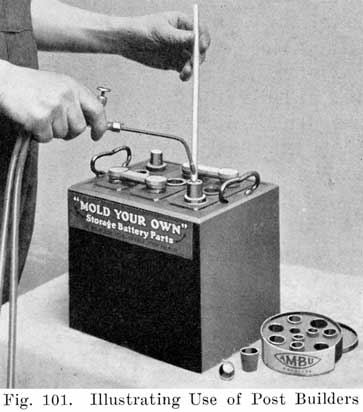 Post Builders. These are moulds which are set over the stumps of -posts which have been drilled short in removing the inter-cell connectors. Lead is then melted in with a burning flame to build the post up to the proper height. Figure 100 shows a set of post-builders, and Figure 101 illustrates their use.