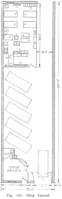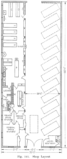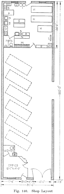 If a shop is rented, it may not be possible to follow any of the layouts shown in Figs. 136 to 142. However, the layout which is best adapted for the actual shop should be selected as a guide, and the equipment shown obtained. This should then be arranged as nearly like the pattern layout as the shop arrangement will permit.
