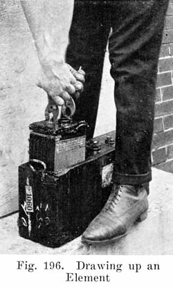 To continue the actual work on the battery. The battery being fully charged,--the electrolyte clear, the plates of normal color, the specific gravity no longer rising,--remove it from the charging bench and put it on the work bench. Draw each element and let drain as in Fig. 197.