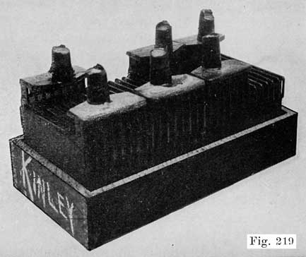 With the element reassembled, and the remaining separators in their proper positions, see that all the plates are level on bottom, and no foreign matter sticking to them. Place the element in box shown in Fig. 219 to keep clean. Reassemble the other elements in exactly the same way, and put them in the box. The elements are now ready to be put in the jars.