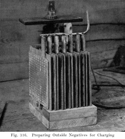 Place the plates of a positive group between the plates of a negative group and lay the element thus formed on its edge, as shown in Fig. 329.