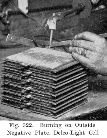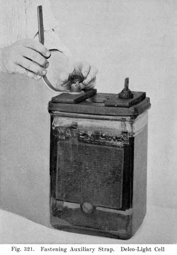 Jars. Both glass and rubber are used for farm lighting battery jars, and they may or may not have sealed-in covers. Fig. 294 shows a glass jar of an Exide battery having a hard rubber cover, and Fig. 295 shows a Prest-O-Lite glass jar cell having a cover made of lead and antimony. Unsealed glass jars, such as the Exide type shown in Fig. 324, generally have a plate of glass placed across the top to catch acid spray when the cell is gassing. Each jar with its plates and electrolyte forms a complete and separate unit which may easily be disconnected from the other cells of the battery by removing the bolts which join them. In working on a farm lighting battery, the repairman, therefore, works with individual cells instead of the battery as a whole, as is done with automobile batteries.