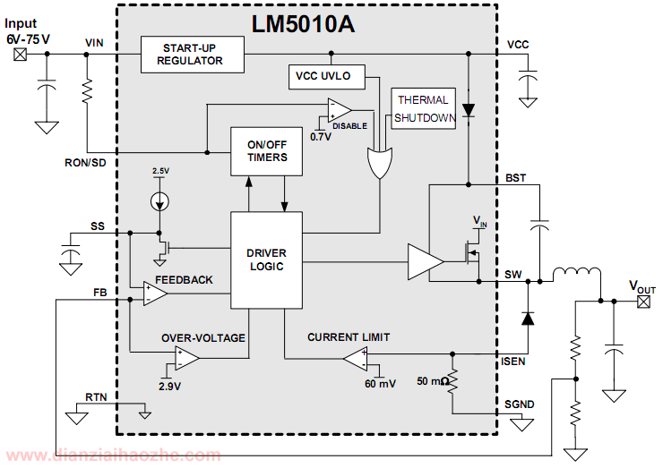 LM5010A方框图和应用示意图